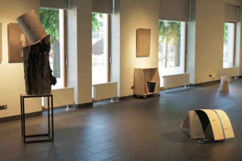 The work ///(((! consists of several sculptural objects and oil paintings on canvas, which are based on the idea of sound. Their visual solutions show parallels with musical instruments, sound equipment, reverse engineering practice, as well as some unknown, parallel lives. Visual exploration carries audio experiences and sources into the analogies of the visual language and the transcendental.